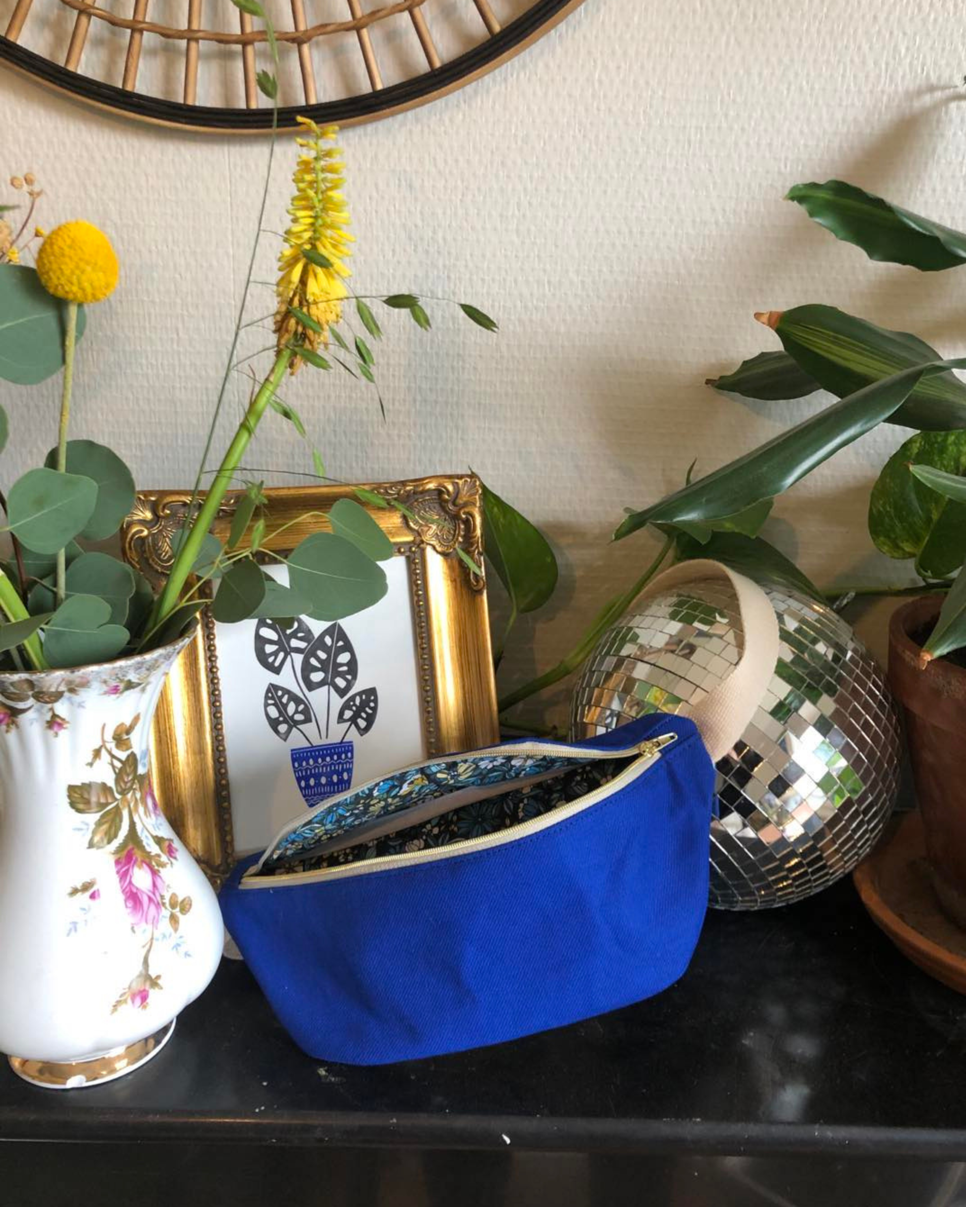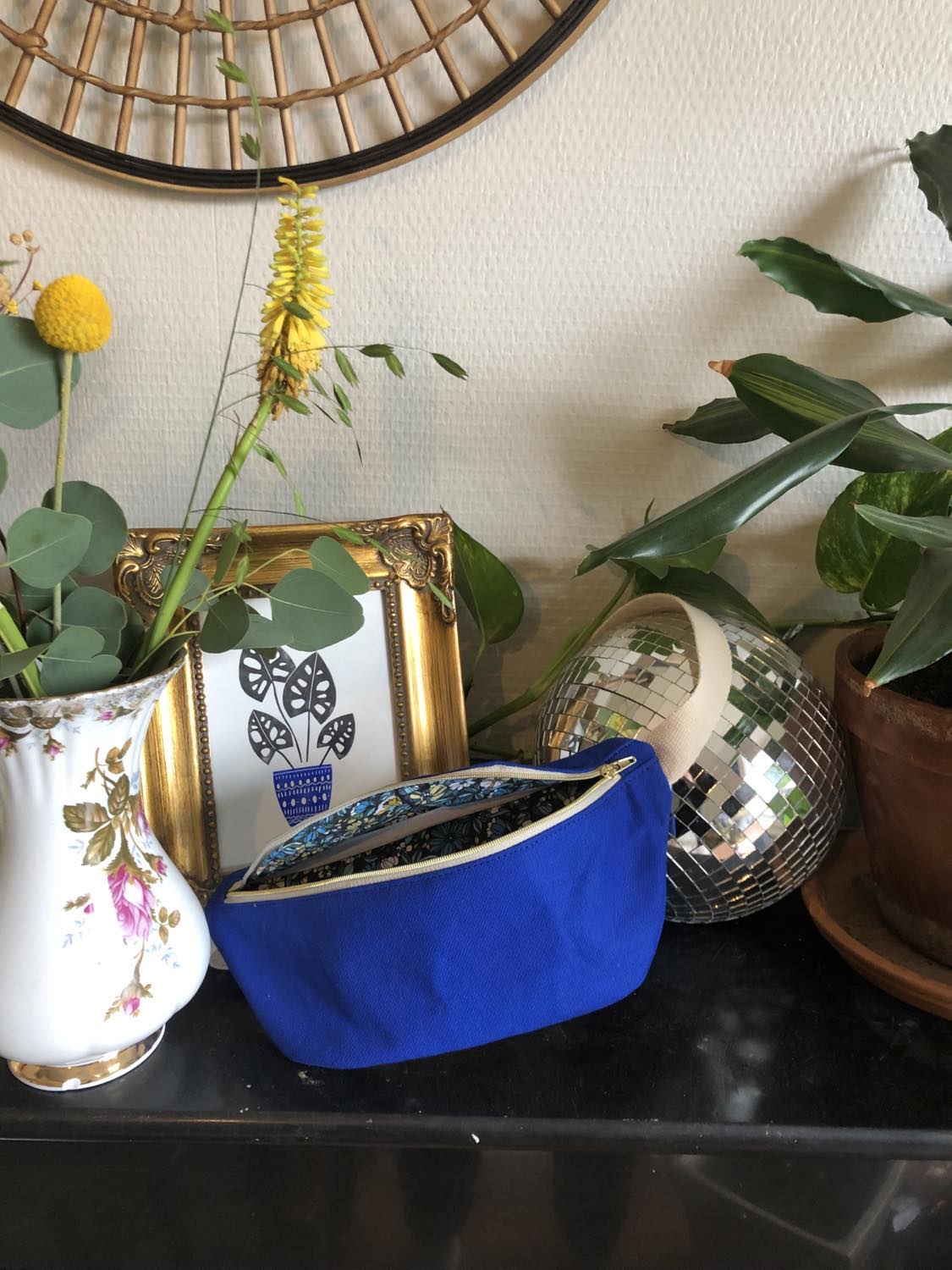 - Sacoche banane confectionnée à la main avec soin, mettant en avant un tissu couleur bleu électrique assorti d'une doublure fleurie.